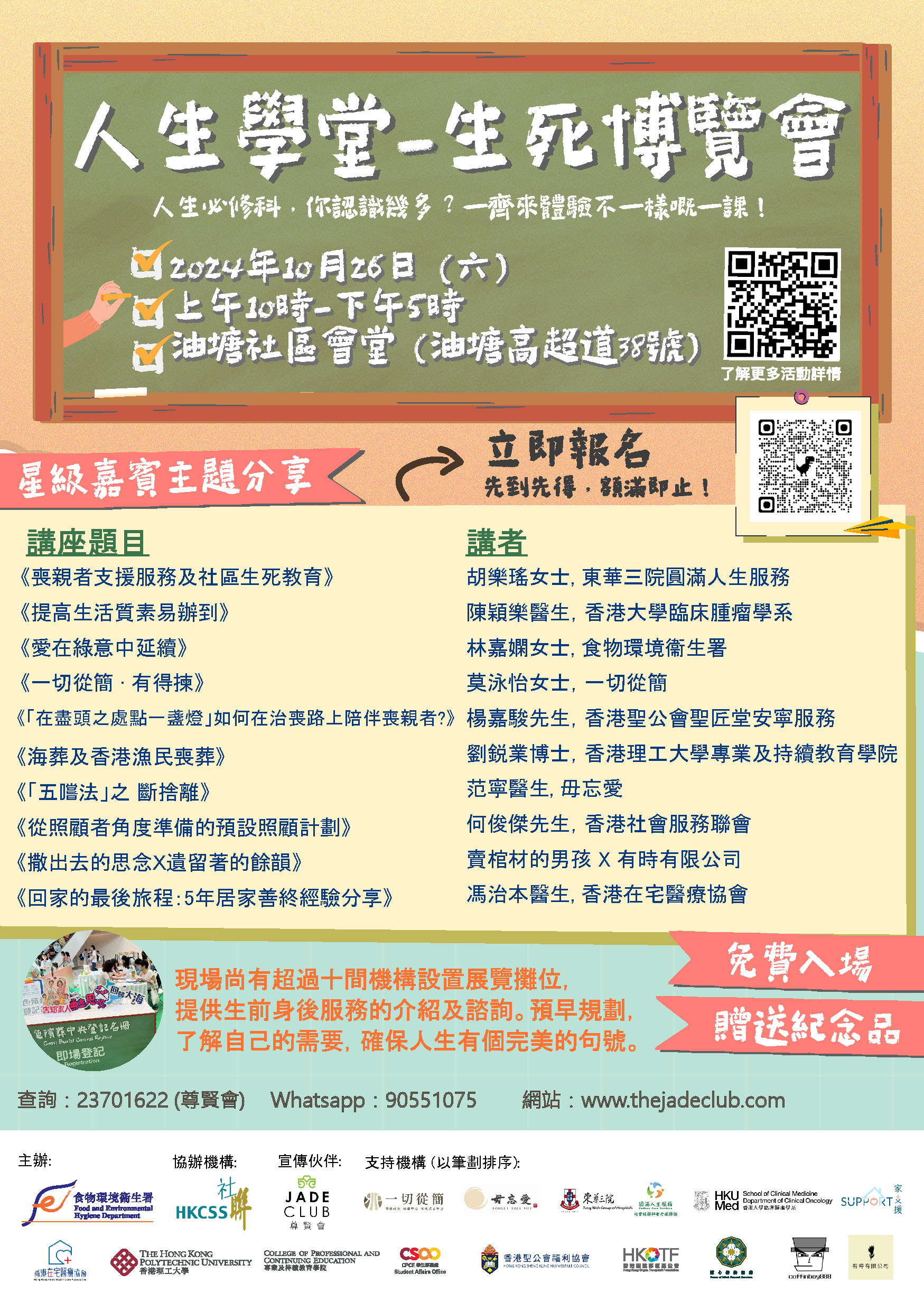 食环署联同多个机构于油塘社区会堂举办「人生学堂 - 生死博览会」。活动包括生前身后规划讲座,让市民了解如何为自己和家人制定预设照顾计划和后事安排。届时多间机构亦会设立摊位,详细介绍其服务,例如生前和身后事务及绿色殡葬中央名册登记等。活动费用全免,市民可即场参加。