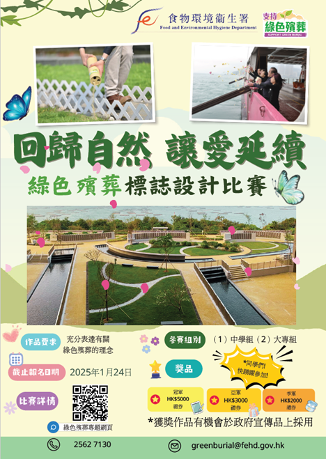 食物环境衞生署(下称「本署」)举办之「回归自然 – 让爱延续」绿色殡葬标誌设计比赛已圆满结束。是次比赛反应踊跃,收到众多设计精湛、寓意深远之参赛作品,充分展现参赛者对绿色殡葬理念的创意诠释与人文关怀。比赛分设「大专组」(全日制)及「中学组」(全日制),各组别设冠军、亚军、季军各一名及优异奖各五名。本署已透过电邮个别通知所有得奖者领奖安排,请获奖者留意邮件并依指示办理后续事宜。