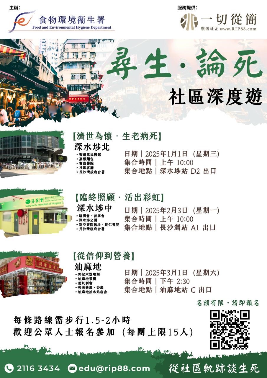| 活動: | 食環署舉辦社區深度遊,讓參加者透過社區導賞,認識社區特色景點及設施,從而探討與反思生死教育的議題。歡迎任何有興趣人士參與,費用全免。名額有限,先到先得。 |