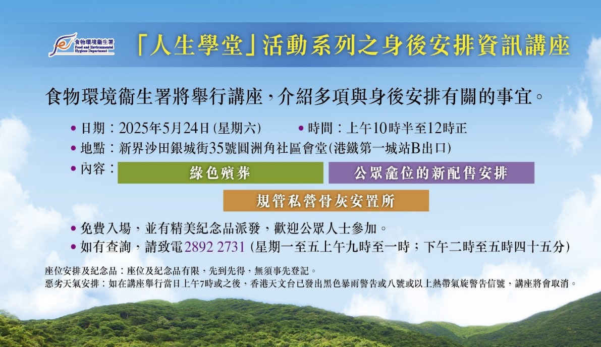 食環署將於圓洲角社區會堂舉辦「身後安排資訊講座」,介紹綠色殯葬、公眾龕位的新配售安排及規管私營骨灰安置所。